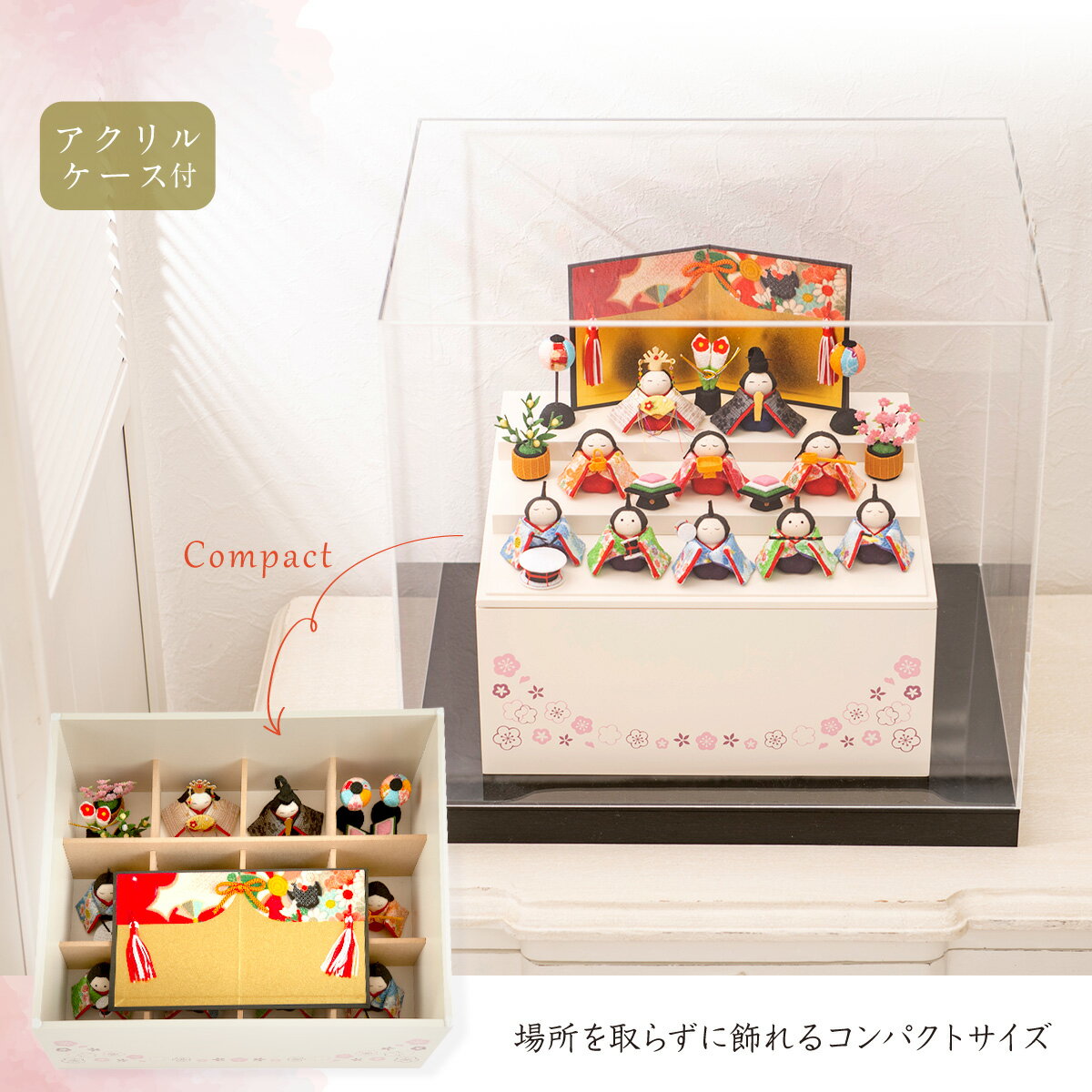 ◆【2021年新作】 雛人形 コンパクト おしゃれ 木製収納ケース アクリルケース入り【収納飾り 三段 ちりめん 令花 れいか雛 ホワイト オリジナル】 数量限定 特選 ケース飾り 10人飾り/親王/三人官女/五人囃子 龍虎堂/リュウコドウ◆品番:1-HK344OR-W-1C使用時期:ひな祭り 雛祭り 初節句 節句飾り用途:飾り物 オブジェ 人形 和雑貨素材:レーヨンちりめん・レーヨン・桐・アクリル生産国:日本付属:お雛さま・お内裏さま・三人官女・五人囃子・雪洞・桜橘・菱餅・花器・屏風・台雛人形サイズ(cm):全体-幅約30/奥行24/高さ28・女雛-幅約6.6/高さ5.5商品特徴:当店オリジナルの収納飾り※当店オリジナル名入れ立札つきの商品です。