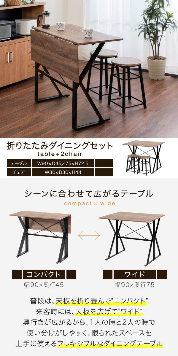 商品詳細 商品説明シーンに合わせて天板サイズを変更できるダイニングテーブルにイス2脚が付いたダイニング3点セット。